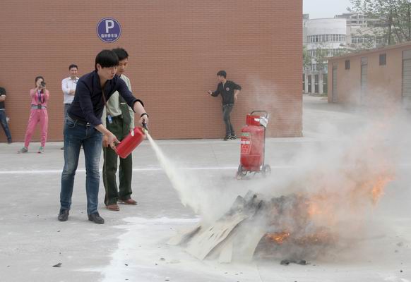 此次消防演练活动分为讲座和实地灭火两大部分。来自经开区消防支队的消防员胡强向大家介绍了生活中火灾可能会发生的隐患以及火灾的紧急处理办法、灭火办法、逃生、自救等注意事项和灭火器的使用方法。在认真听讲及观摩后,老师同学们亲自体验了现场灭火的过程。面对熊熊的火堆,大家表现非常沉着冷静,熟练地按照灭火的步骤和方法,将燃起的大火迅速扑灭,做到了沉着冷静面对突发情况并成功快速扑灭大火的消防标准。