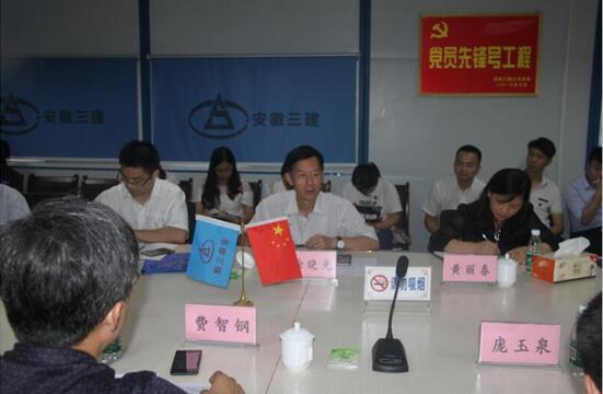 为深入贯彻中央群团工作会议精神,进一步落实团干联系团员青年的制度,有序有力推动共青团工作改革创新, 6月23日,省国资委群众工作处副处长、团工委副书记费智钢,应邀到合肥市二院项目部参加安徽三建团委专题开放日活动,并为公司团委获得2015年度安徽省“五四红旗团委”授牌。省国资委团工委庞玉泉、建工集团工会主席、公司党委书记徐晓光、建工集团团委书记王诗旵及公司纪委书记黄丽春、团委书记张鑫等陪同。公司在肥团支部负责人、项目一线青年代表共30余人参加了开放活动。