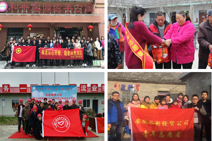 三是传递爱心服务他人。安徽一建为合肥春雨儿童康复中心的残障儿童送去温暖和关爱。安徽二建以“敬老从心开始,爱老从我做起”为主题走进敬老院。安徽三建向金寨县桃岭乡先瑞小学捐赠教学器具。安徽水利为贫困家庭和留守儿童征集书包、书籍、玩具,帮助他们实现自己的微心愿。安徽路桥关注留守、贫困儿童,为他们送去学习用品。安徽路港、安建地产慰问孤寡老人和贫困家庭,给敬老院送去生活必需品。安建海外送爱心到合肥春芽残疾人协会,为残疾人士带去生活和学习用品。