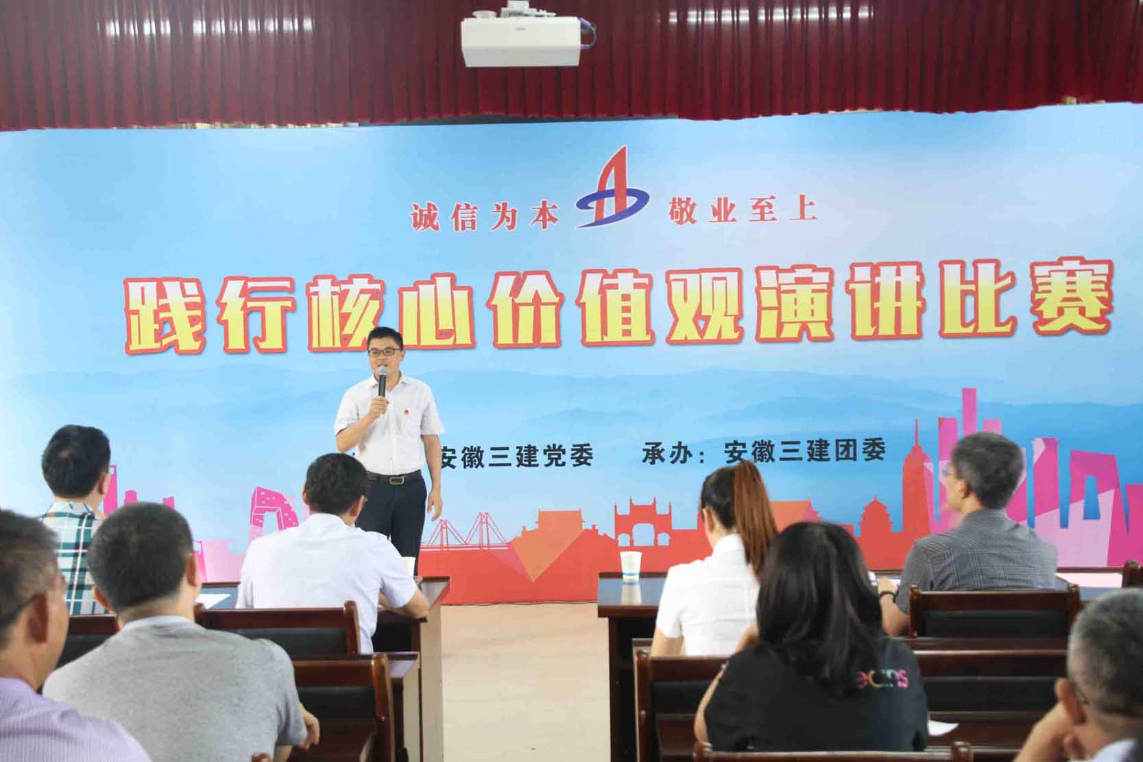 安徽三建团委响应党委和上级团委的号召,积极推进“建工青年践行核心价值观”系列活动,举办“诚信为本 敬业至上 践行集团核心价值观”主题演讲活动。来自一线的20名青年员工参加l了演讲,他们围绕“诚信为本 敬业至上”核心价值观主题,结合各自工作和生活经历,用真挚的情感、朴实的语言、生动的事例,声情并茂、满怀激情地讲述了安徽三建人在实现“省内领先、国内一流”的宏伟愿景中,立足岗位,恪守诚信、建功立业的深切体会和诚实守信、爱岗敬业的感人故事;项目工地的“老黄牛”、克难攻坚的“先锋队”、企业发展的“排头兵”……在选手们声情并茂的演讲中,生动再现了先进模范人物坚韧不拔、敬业奉献的形象,用发生在身边的感人事迹、工作亮点、工作感悟和经验做法,感染了在座的每位观众,赢得了评委和观众的阵阵掌声,让每一位听众的心灵受到一次了正能量的洗礼。比赛中,选手们激情饱满,感情真挚,从不同层面、不同角度倾情讲述,生动刻画模范的朴实形象,展现身边员工于平凡中奉献青春、于艰苦中助力改革、于岗位中磨练尖兵的朴实情怀。