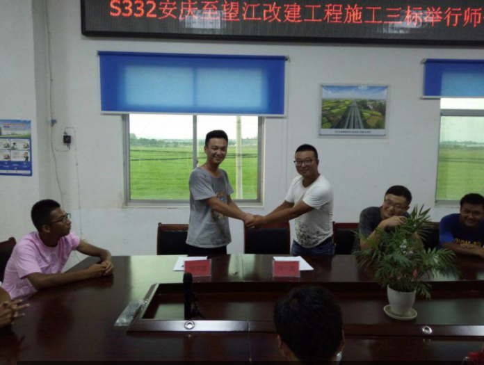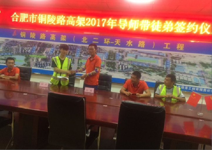 在铜陵路高架项目部,与会老员工结合自身岗位职责,一一分享自己的入职经历,给新员工提出了意见建议,要求新员工转变观念,尽快适应和融入角色,锻炼自己早日成长成才,为服务企业发展贡献力量。团支部书记石海涛阐述了“导师带徒”活动的目的和意义,要求导师通过“传、帮、带”的方式,将技术知识、职业道德作风传授给新员工,切实有效地加快新学员理论知识到实践能力的转换进度,使新员工尽快更好地适应工作岗位,全身心地投入到工作和学习中。 3对师徒经过交流认知,双向选择后,现场签字确立师徒关系。