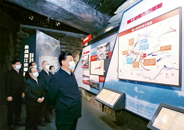 2021年4月25日至27日,中共中央总书记、国家主席、中央军委主席习近平在广西考察。这是25日上午,习近平在桂林市全州县,参观红军长征湘江战役纪念馆。 新华社记者 鞠鹏/摄