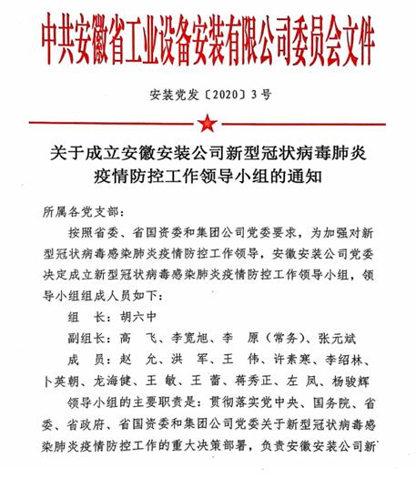 一是组织到位。1月26日,安徽安装公司下发《关于成立新型冠状病毒感染肺炎疫情防控工作领导小组的通知》,负责贯彻落实上级关于新型冠状病毒感染肺炎疫情防控工作的重大决策部署,负责安徽安装公司新型冠状病毒感染肺炎疫情防控工作的领导,研究解决安徽安装公司疫情防控中的重大问题,统筹组织防控处置。