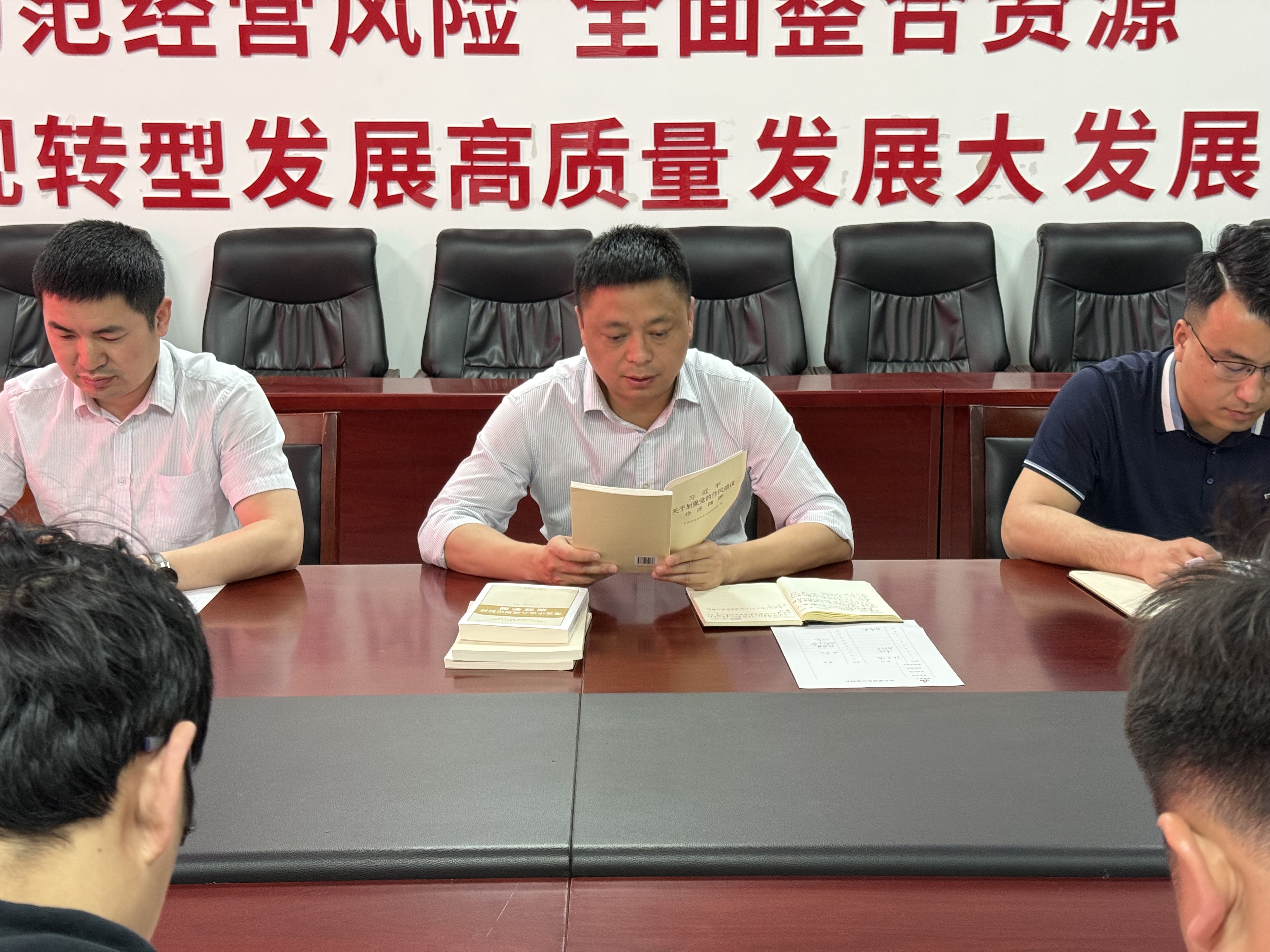 专题学习会以“领学+共读”形式展开。党委书记、董事长、总经理张玉明领学《习近平关于加强党的作风建设论述摘编》第一章“党的作风关系人心向背,决定党和国家事业成败”;随后,党员采取轮值领读方式,逐页领学第二章“作风问题本质上是党性问题”,现场学习氛围浓厚。