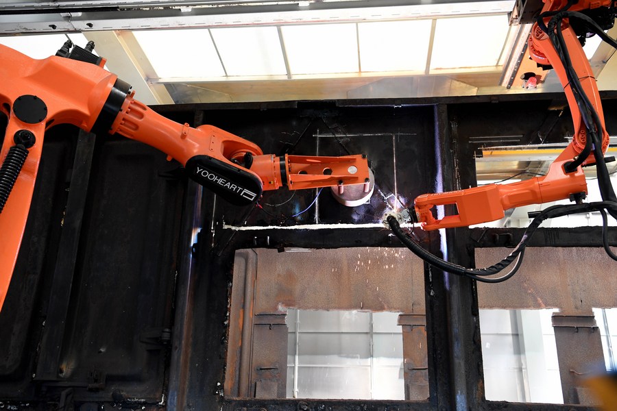 Robots dismantle automatically a scrap freight wagon at the intelligent production base for recycling railway materials in Ma'anshan, east China's Anhui Province, July 14, 2021. (Xinhua/Liu Junxi)