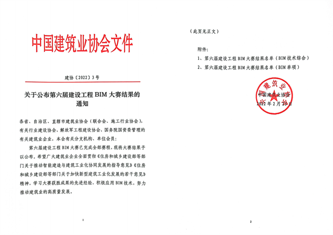 This competition, organized by China Construction Industry Association, is the most recognized national BIM competition in China at present, aiming to vigorously promote the application of BIM technology and cultivate high-level BIM technical talents. Contents of the competition involved many fields such as housing construction, road and bridge construction, water conservancy and manufacture industry, etc., and finally 96 submittals (72 comprehensive items and 24 single items) won as the achievements of the first-class category.
