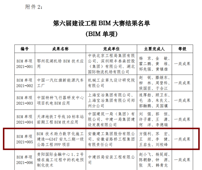Recently, the list of winners of the 6th Construction BIM Competition of China Construction Industry Association was announced, the tech participated in the competition - “Digitization construction assisted by BIM technology in the implementation of the 1st Class Highway Project - Phase II G347 AnJiu on PPP basis” submitted by the Design Institute of ACEG Road & Bridge Co., Ltd., stood out from 995 candidates and won the fifth place in the single item competition, which marks the first ever for ACEG winning the top class achievement in national BIM competition.